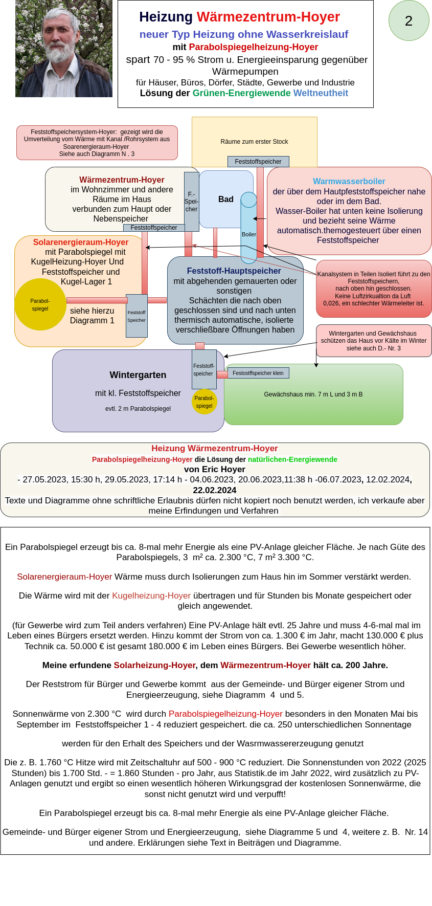 My inventions, processes, and applications – such as the Natural Energy Centers-Hoyer, the Heating-Warming Center-Hoyer, the Sphere Heating-Hoyer, and the Solid Storage-Hoyer – have proven through calculations that electricity, heat, energy, and hydrogen can be generated much more cost-effectively and environmentally friendly using solar heat and the Solar Systems-Hoyer. These systems have the potential to meet the climate goals set for 2045, as they enable a secure base load energy supply through decentralized solutions for communities, cities, businesses, and industries.
